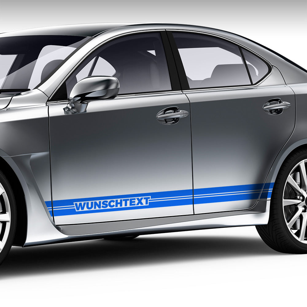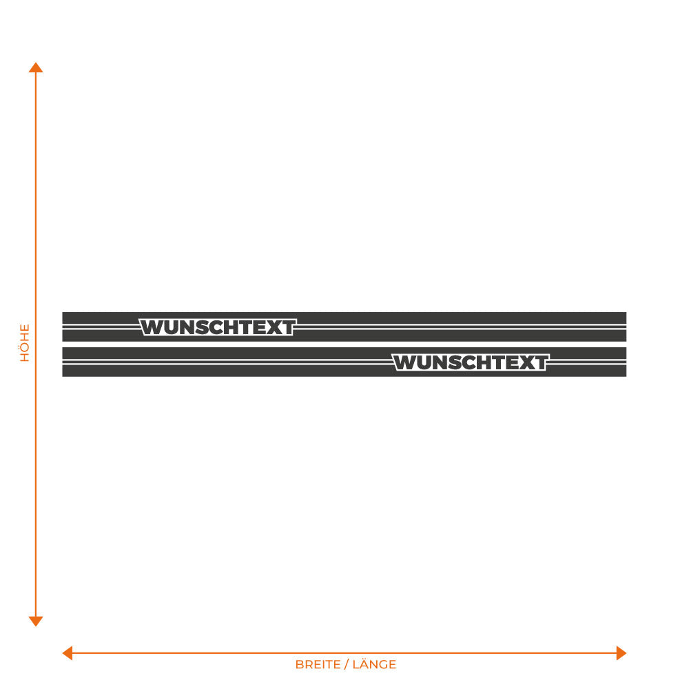 Verleihe deinem Fahrzeug eine markante und sportliche Präsenz mit diesem dynamischen Triple-Streifen-Design. Das Dekor besteht aus drei parallel verlaufenden Linien – zwei breiteren Außenstreifen und einer feinen Mittellinie – die für eine symmetrische und kraftvolle Optik sorgen. Das Highlight dieses Designs ist der persönliche Wunschtext, der perfekt im Streifen integriert ist und dein Auto zu einem echten Einzelstück macht. Damit das Dekor perfekt mit deinem Fahrzeug harmoniert, ist dieser hochwertige Aufkleber in individueller Größe und Farbe erhältlich. Im Lieferumfang ist der Dekorbogen mit zwei Motiven für beide Fahrzeugseiten.