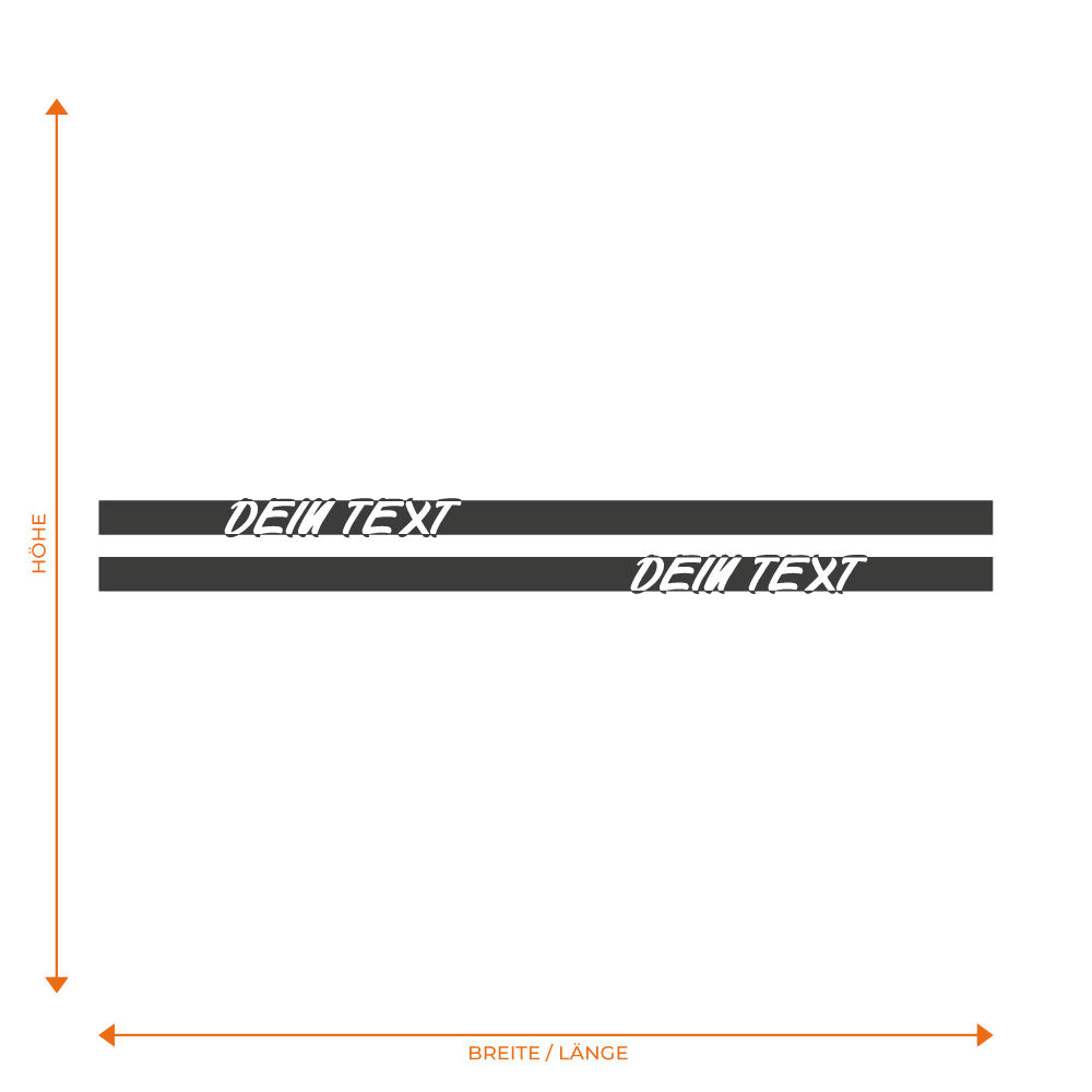 Mach dein Fahrzeug zum Highlight auf der Straße! Mit diesem sportlichen Seitenstreifen im „ausgestanzten“-Design verleihst du deinem Auto eine exklusive Note. Das Besondere: Du kannst das Dekor mit deinem eigenen Wunschtext personalisieren und so eine ganz eigene Botschaft vermitteln. Damit das Design perfekt zu deinem Wagen passt, ist der Aufkleber in individueller Größe und Farbe erhältlich. Im Lieferumfang ist der Dekorbogen mit zwei Motiven für beide Fahrzeugseiten.