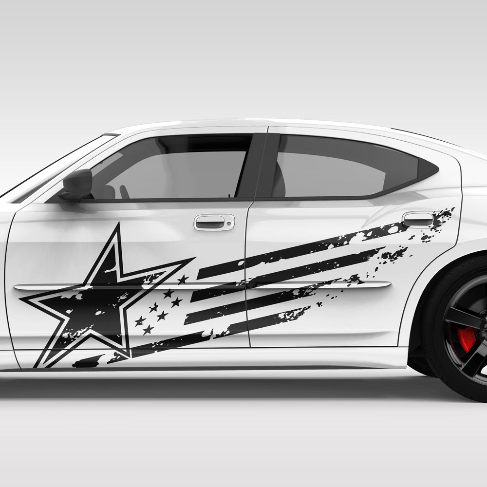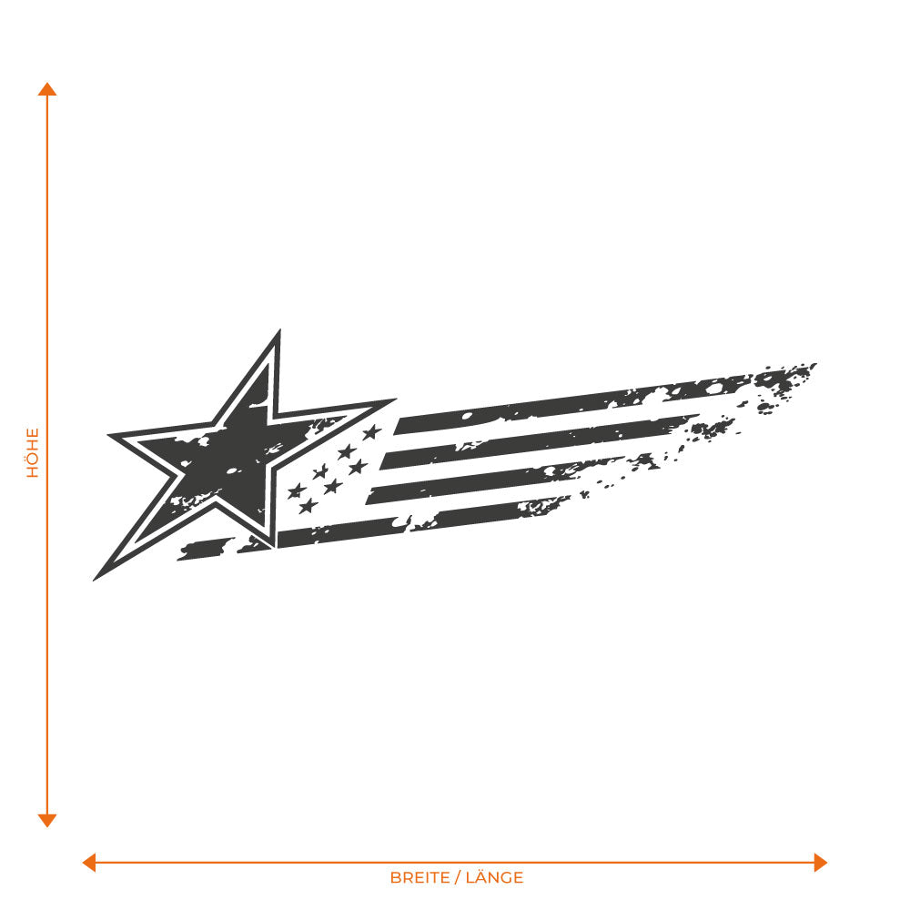 Auffällig und selbstbewusst präsentiert sich dieses US-Flaggen Seitendekor mit Stern- und Streifenmotiv im angesagten Grunge-Stil. Die dynamischen Linien sorgen für eine sportliche Optik und verleihen deinem Fahrzeug einen individuellen Auftritt mit Charakter. Der hochwertige Autoaufkleber eignet sich ideal für die Seitenfläche und setzt starke Akzente im Straßenbild. Er kann in individueller Größe und Farbe gefertigt werden, damit das Design optimal zu deinem Fahrzeug und deinem persönlichen Stil passt. Im Lieferumfang ist der Dekorbogen mit einem Motiv. Für die Verklebung auf beiden Fahrzeugseiten können zwei Motive, und eines davon gespiegelt, bestellt werden.