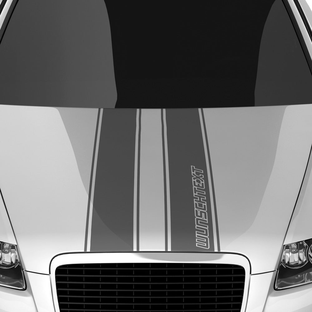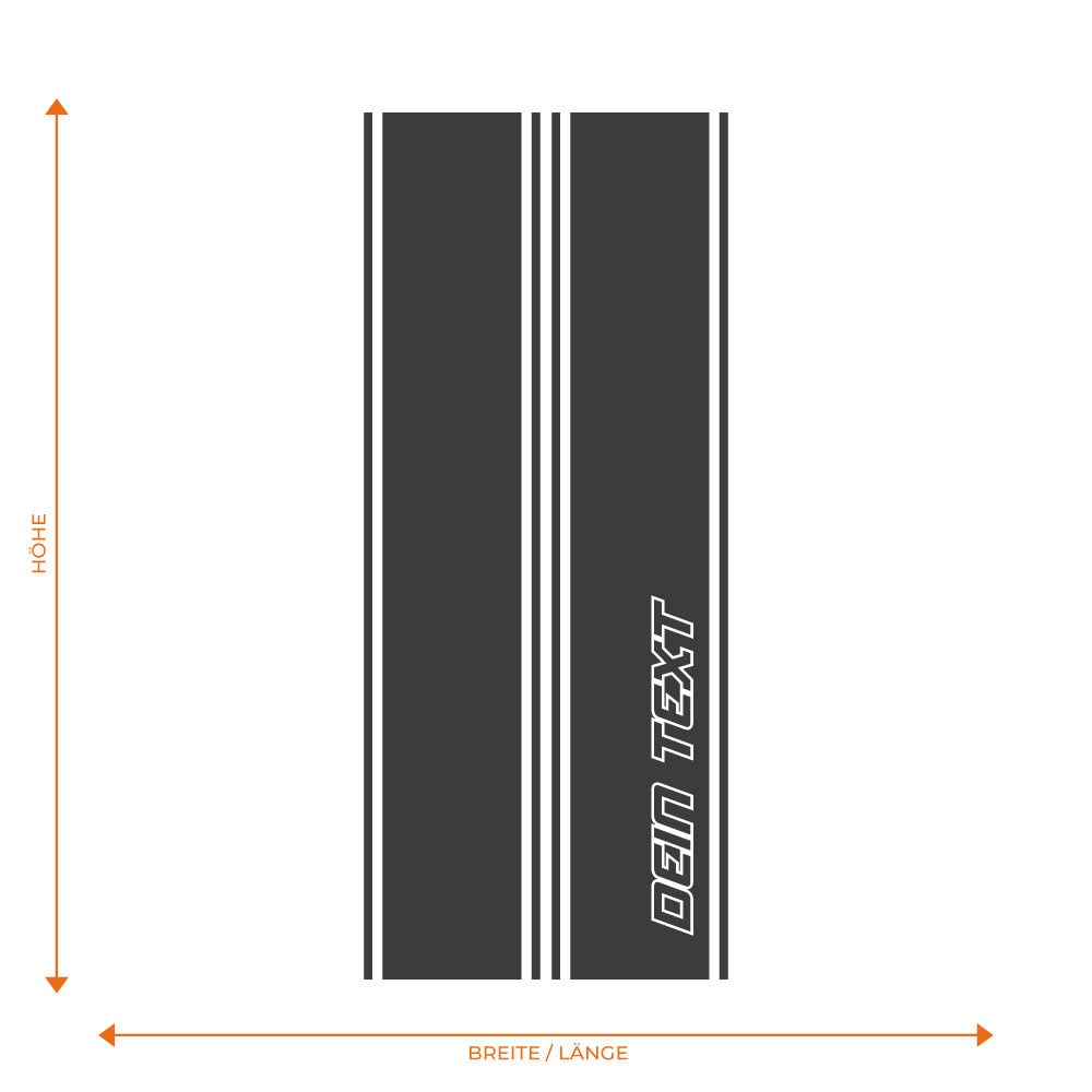 Verpasse deinem Wagen einen unverwechselbaren Charakter mit diesem breiten Doppel-Rennstreifen inklusive Wunschtext. Das markante Design sorgt für eine kraftvolle Präsenz auf der Straße und lässt sich durch deinen eigenen Schriftzug perfekt personalisieren. Da jedes Fahrzeugprojekt einzigartig ist, wird dieser Aufkleber aus hochwertiger, wetterfester Qualitätsfolie gefertigt und ist bei uns in individueller Größe und Farbe erhältlich. Im Lieferumfang ist der Dekorbogen mit beiden Motiven, eines davon wie abgebildet mit Text.