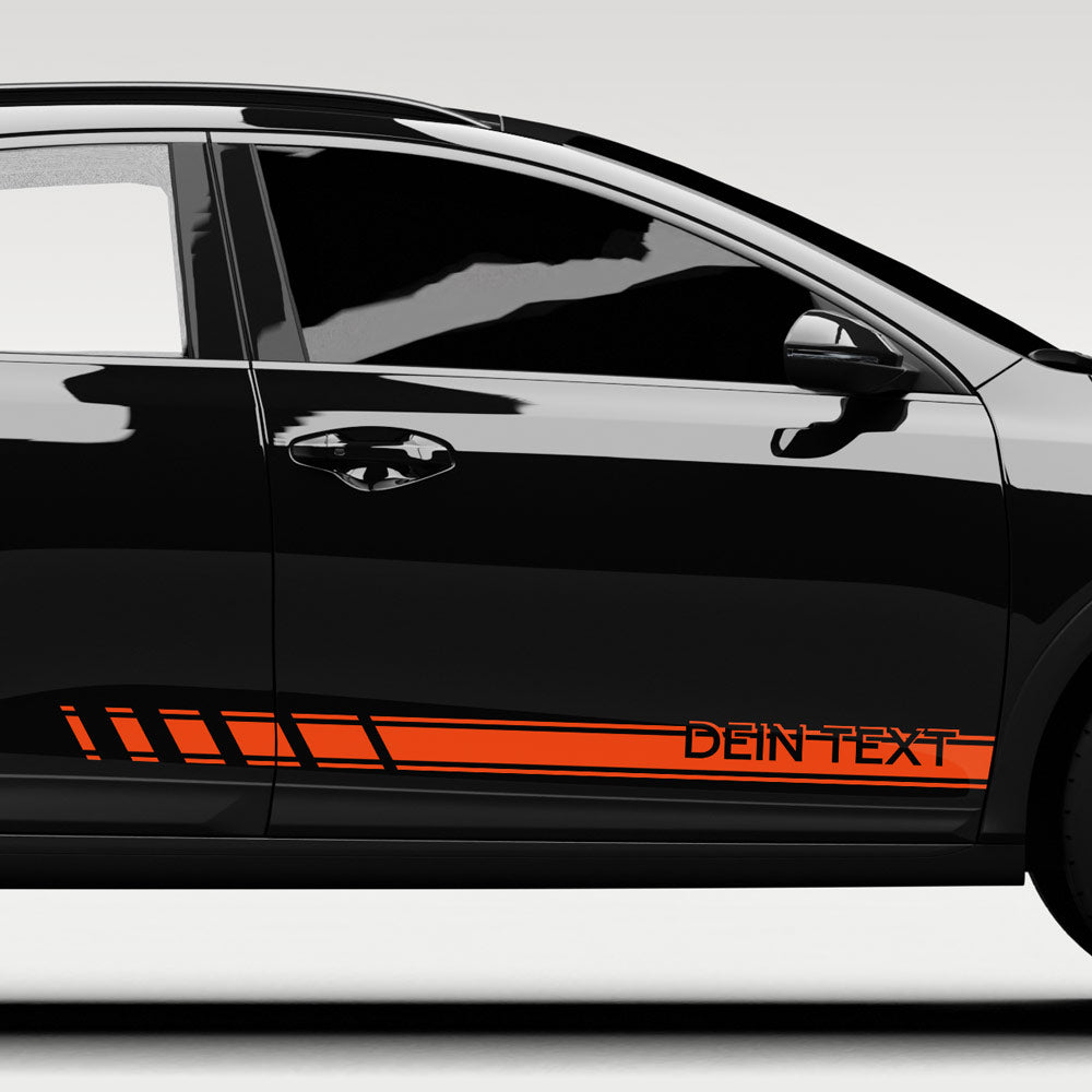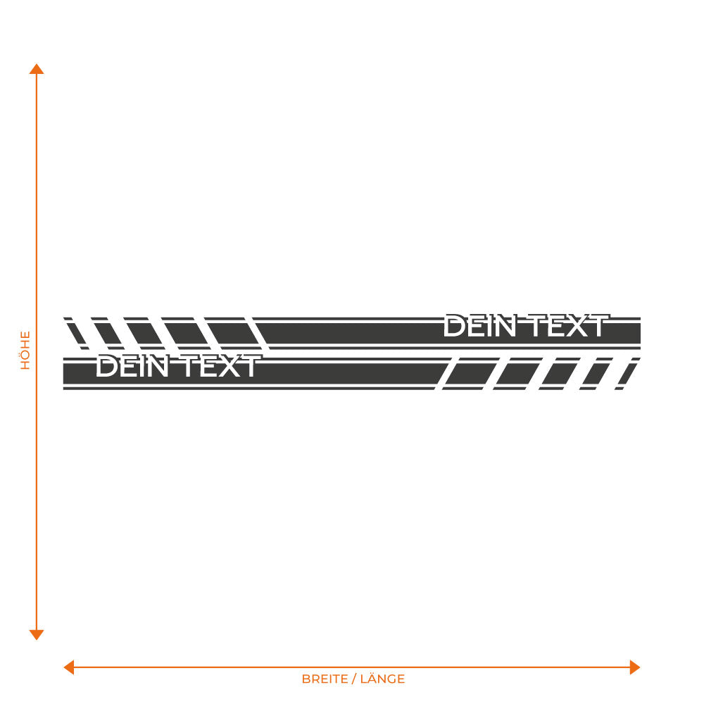 Verleih deinem Fahrzeug einen individuellen und extrem dynamischen Look mit diesem modernen Seitenstreifen-Dekor. Das Design besticht durch markante, schräge Balken, die in einen eleganten Doppelstreifen übergehen. Das Besondere an diesem Motiv ist die persönliche Note: Am Ende des Streifens ist Platz für deinen ganz eigenen Wunschtext, der das Design perfekt abrundet. Damit der Aufkleber optimal mit deiner Wagenfarbe harmoniert, ist er in individueller Größe und Farbe erhältlich. Die hochwertige Folie sorgt für ein professionelles Finish, das wie lackiert wirkt und lange hält. Im Lieferumfang ist der Dekorbogen mit zwei Motiven für beide Fahrzeugseiten.