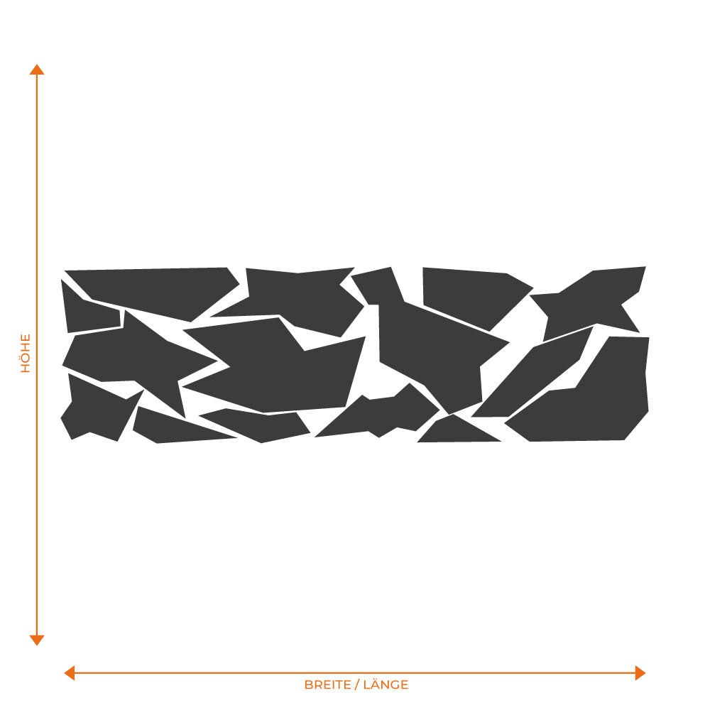 Dynamischer Stealth‑Camouflage-Aufkleber in Premium‑Vinyl: abstrakte, kantige Formen zur freien Verteilung. Leicht anzubringen und rückstandslos entfernbar. Ideal für Türen, Seitenpartien oder Heck. In individueller Größe und Farbe erhältlich - verleihe deinem Fahrzeug einen markanten, urbanen Look. Im Lieferumfang ist der einfarbige Dekorbogen mit allen abgebildeten Elementen. Um Elemente in mehrere Farben zu kombinieren musst du mehrere Bögen kaufen.